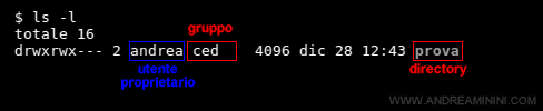 La directory è associata allo username “andrea” e al gruppo “ced”.