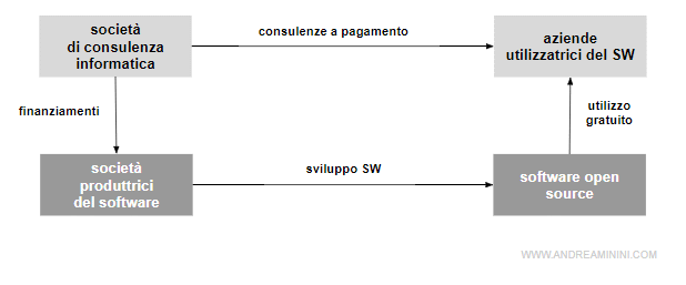 - Consulenze presso le aziende che utilizzano il software. Il software open source è ceduto gratuitamente ma gli sviluppatori guadagnano indirettamente tramite le consulenze professionali offerte le aziende che lo utilizzano. Gli sviluppatori offrono le attività di supporto, manutenzione e personalizzazione del codice. Del resto, se il software fosse con licenza di utilizzo a pagamento, probabilmente non riuscirebbero mai a vincere la concorrenza dei più blasonati software commerciali. Come insegna John Nash nella teoria dei giochi, gli sviluppatori Linux fanno del bene agli altri non per generosità ma come mezzo per fare bene a se stessi. In pratica, creano la propria domanda.
