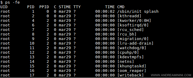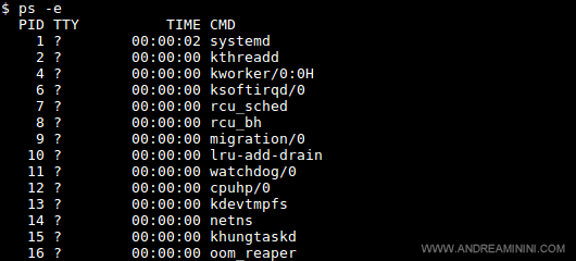 Attenzione. Il comando ps non mostra tutti i processi che stanno girando del sistema ma soltanto quelli dell'utente. Per vederli bisogna specificare l'opzione -e.