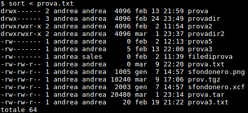 In questo modo imposto il file prova.txt come input del primo comando ( SORT ).