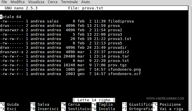 Per fare una verifica posso visualizzare il contenuto del file appena creato con il comando CAT oppure con un editor di testo ( es. Nano ).