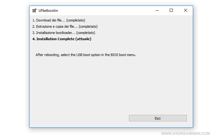 Il programma scarica i files di installazione della distribuzione Linux, li estrae e crea un bootloader sulla chiavetta USB.