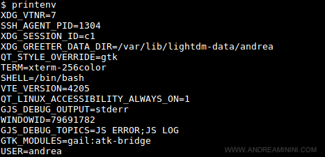 Per visualizzare i valori di tutte le variabili di ambiente, digito il comando printenv senza aggiungere nulla.
