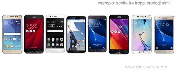 Quando i prodotti sono troppi e simili, l'utente evita qualsiasi decisione perché subentra l'indecisione e la paura di sbagliare l'acquisto.