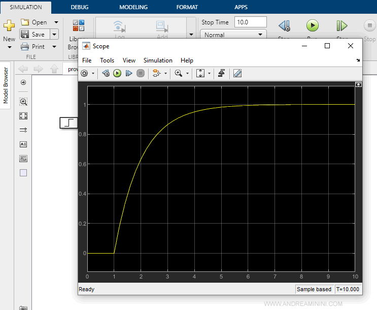 Al termine della simulazione clicco due volte sul blocco Scope per vedere la risposta del sistema.