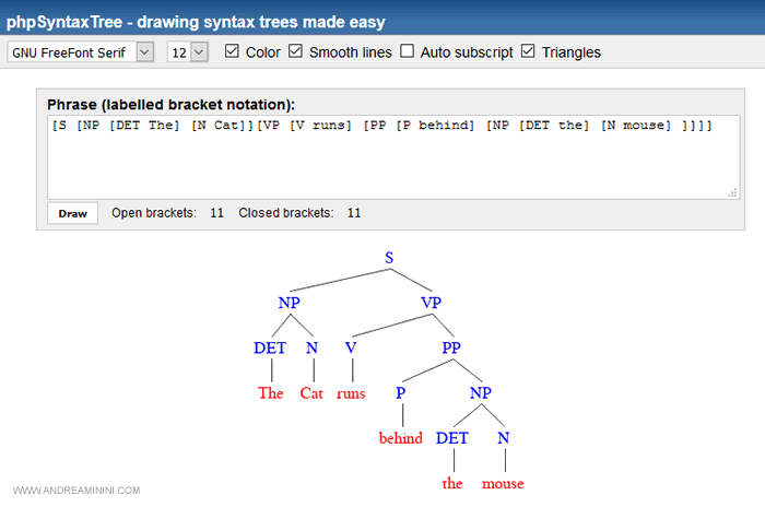 - PhpSyntaxFree. E' una risorsa gratuita. Mi consente di disegnare un albero sintattico testuale da una stringa di testo. Ogni nodo dell'albero è racchiuso tra parentesi quadre []. All'interno delle parentesi va digitata una coppia di valori. Il primo indica il tag POS mentre il secondo la parola ( word ). Per creare le ramificazioni basta inserire altre parentesi quadre all'interno di quelle già presenti. Infine, per visualizzare l'albero premo sul pulsante Draw.