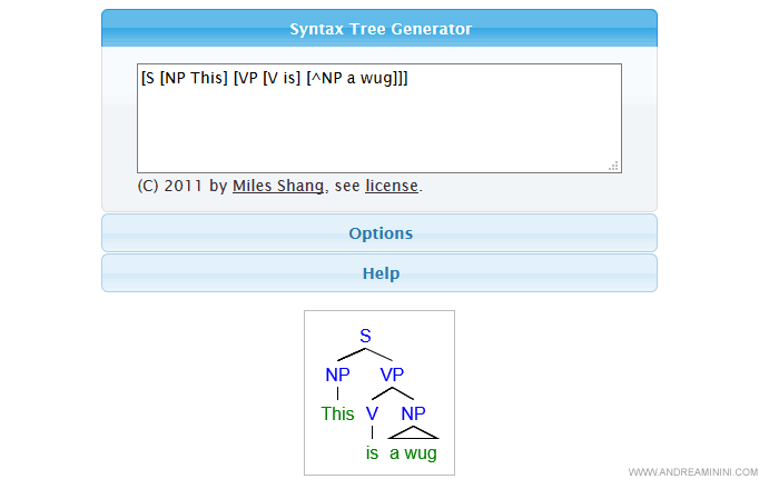 Nota. I syntax tree generator visualizzano l'albero sintattico in forma grafica senza analizzare la frase. Per analizzare la sintassi di un testo bisogna usare un software diverso detto parser o syntax analyzer.