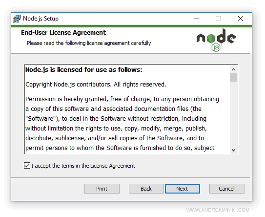Nota. L'installazione di NodeJs è gratuita. Si tratta di un software open source. Pertanto, può essere liberamente usato e modificato rispettando gli stessi termini di utilizzo.