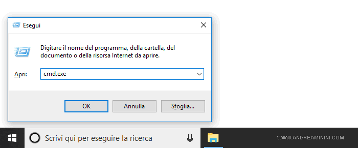 Poi digito cmd.exe nella casella Esegui e clicco sul pulsante OK oppure do invio.