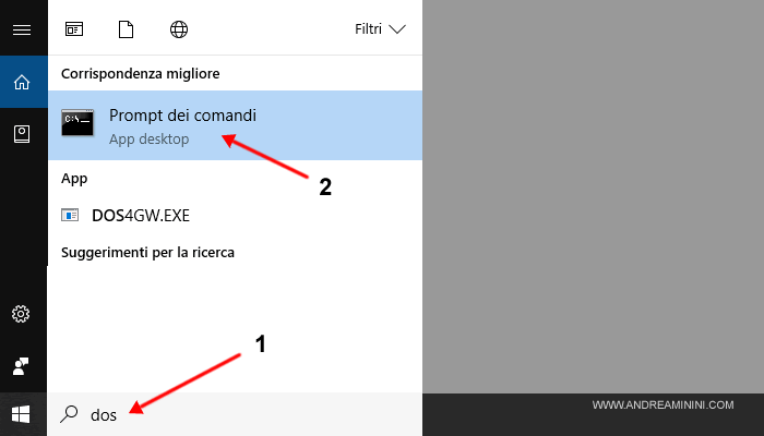 In alternativa, per aprire il prompt dei comandi su Windows 10 scrivo "dos" nel campo di ricerca in basso a sinistra.