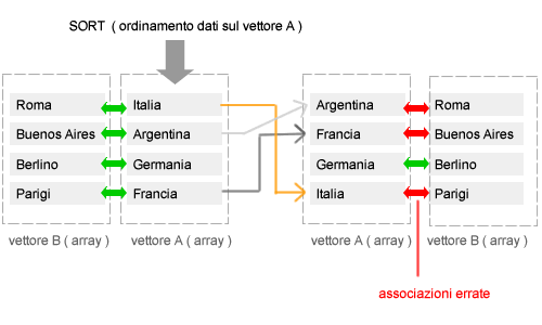 Le cose si complicano quando devi elaborare una matrice, ossia un vettore multiplo o array multidimensionale, dove hai due vettori associati tra loro ma non puoi ordinarli singolarmente perché l'ordinamento farebbe perdere l'associazione sulla disposizione dei record nei due vettori. Nella seguente dimostrazione ogni campo del primo vettore è associato al corrispettivo campo del secondo vettore, e così via. Se ordini i due vettori perdi la combinazione originaria fra le posizioni e un'informazione rilevante dei dati nella tabella.