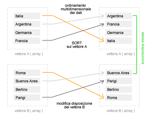 Cercando di capire come fare un ordinamento multidimensionale sul primo vettore senza perdere l'accoppiamento con il secondo, sono incappato in un'istruzione specifica del linguaggio PHP molto utile. Il comando array_multisort ti consente la comparazione e l'ordinamento del primo vettore, in ordine ascendente oppure discendente, mantenendo nello stesso tempo la stessa combinazione nella disposizione dei dati sul secondo vettore.