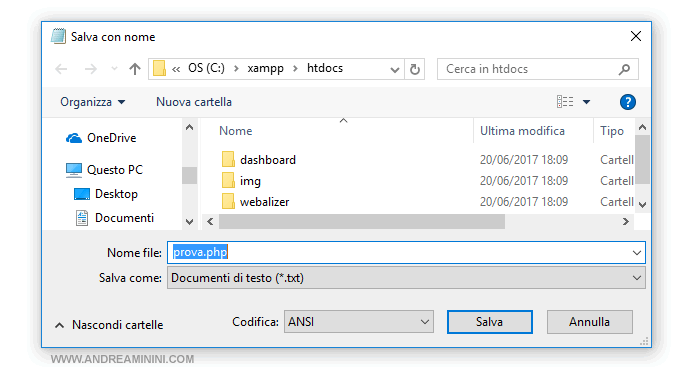 Poi lo salvo con il nome prova.php nella directory xampp/htdocs del mio computer