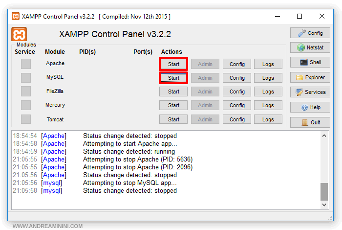 Per avviare Xampp clicco sui pulsanti Start vicino a destra di Apache e Mysql.
