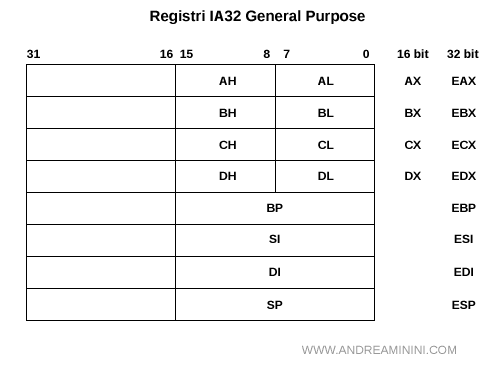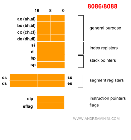 Esempio. L'istruzione MOV scrive il valore della locazione di memoria MSG1 nel registro EAX della cpu. L'istruzione ADD addiziona il valore del registro di memoria AL al contenuto della locazione di memoria MSG1 e la sovrascrive. L'istruzione SUB sottrae dal registro AL il valore numerico decimale 1. E così via. I registri di un vecchio processore 8088 sono i seguenti: