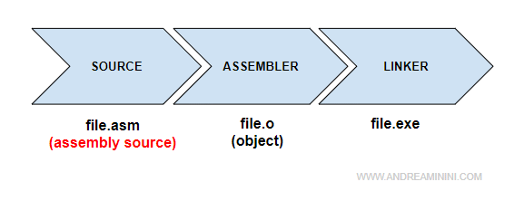 La differenza tra assembler e linker. L'assembler non crea direttamente il file eseguibile ma un file oggetto intermedio con estensione .o ( es. prova.o). I file oggetto sono collegati tra loro da un altro software, detto linker, che crea il file eseguibile vero e proprio ( es. prova.exe ).
