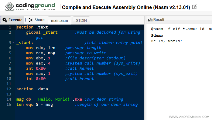 Inizialmente, per esercitarsi a programmare in assembly si può utilizzare anche un emulatore Nasm online.
