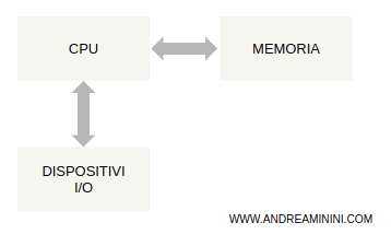 La CPU (Central Processing Unit) è collegata con la memoria e con i dispositivi I/O.