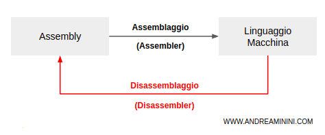 Nota. La fase opposta dell'assemblaggio è il disassemblaggio. Nel disassemblaggio un programma detto disassembler legge il codice in linguaggio macchina e lo traduce in linguaggio Assembly. Il disassemblaggio è usato soprattutto dagli hacker.