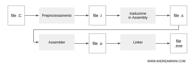Il compilatore traduce il programma scritto in linguaggio C (linguaggio di alto livello) in un programma in linguaggio Assembly (linguaggio di basso livello). Salva il codice sorgente tradotto in Assembly in un file temporaneo con estensione .s che successivamente il programma assemblatore (Assembler) traduce in un file oggetto in linguaggio macchina con estensione .o - Linker