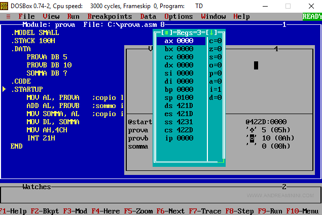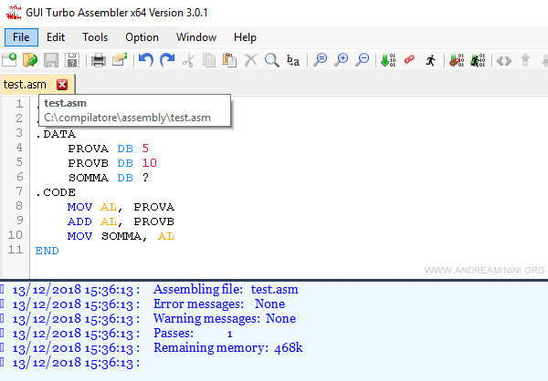 Nota. Il vecchio assemblatore TASM per l'architettura x86 si può usare anche sui pc più recenti usando un emulatore Dos come DosBox. TASM è ancora oggi utilizzato per finalità didattiche. Integra anche un editor e un debugger assembly che agevola la comprensione del funzionamento e l'apprendimento del linguaggio per chi parte da zero.