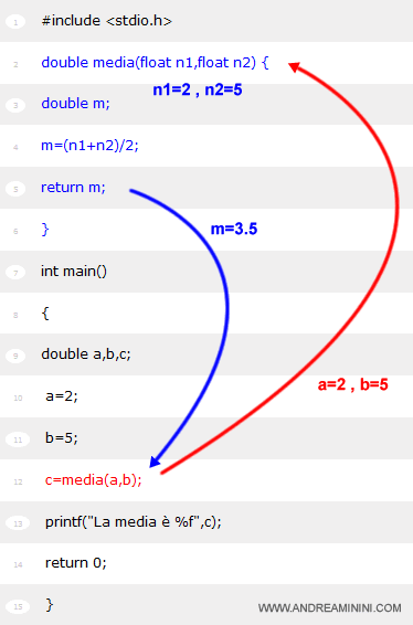 Il programma main() riceve il valore di ritorno (la media) e lo assegna alla variabile c.