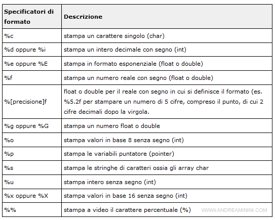 Ecco un elenco di specificatori di formato utilizzabili nel linguaggio C.