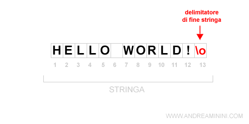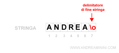 Le stringhe in linguaggio C sono delimitate da un carattere di fine stringa che segue l'ultimo carattere della stringa.