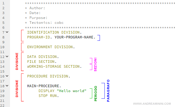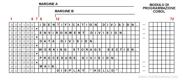 Nota. Nelle versioni più moderne del Cobol molte rigidità sono state eliminate. In ogni caso, suggerisco di continuare a rispettarle per migliorare la leggibilità del codice.