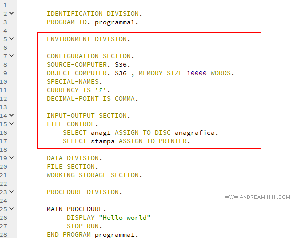 Ciò che è importante in questa pagina è comprendere il funzionamento dell'environment division nella programmazione in Cobol.