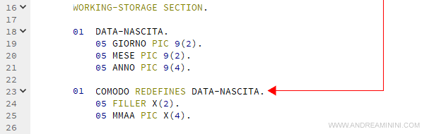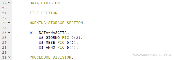 Nel seguente codice definisco i campi dell'area dati DATA-NASCITA.