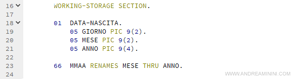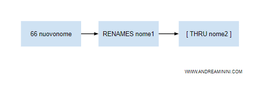 Nota. La clausola RENAMES ha l'handicap di aumentare lo spazio di memoria del programma per gestire i riferimenti dell'area dati. Per questa ragione, spesso al suo posto è utilizzata la clausola REDEFINES.