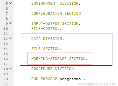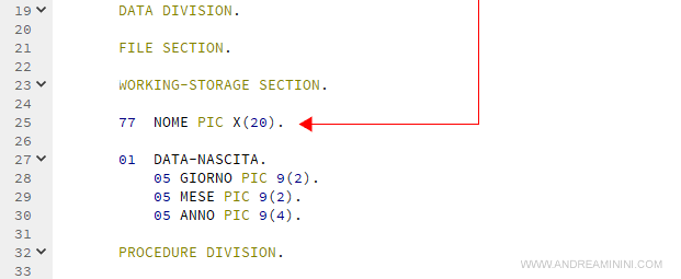 Nota. E' comunque possibile inserire i campi elementari anche con la numerazione 01. In questo caso, non è necessario elencarli all'inizio della sezione. Non è obbligatorio usare il livello77 per i campi elementari anche se è una pratica raccomandata perché rende più leggibile il codice.