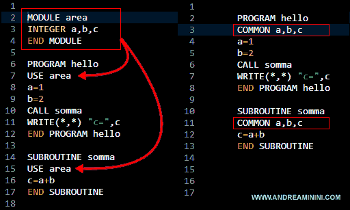 Per definire un'area di memoria comune tra il programma e i sottoprogrammi nel Fortran 90 e versioni successive si usa l'istruzione MODULE mentre nel Fortran 77 si usava l'istruzione COMMON.