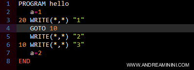L'enumerazione non è obbligatoria in un programma scritto in linguaggio Fortran. E' usata soltanto come etichetta (label) per identificare una particolare linea di codice. Non c'è un ordine logico. Pertanto, l'etichetta 20 può anche precedere l'etichetta 10.