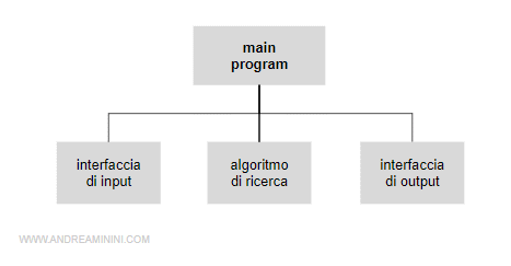 Esempio. Scrivo il programma principale che permette all'utente di fare una ricerca in un'archivio. Poi sviluppo i moduli necessari per l'interfaccia di input e di output e la routine di ricerca nell'archivio. I moduli sono richiamati dal programma principale e sono visti come sottoprogrammi a se stanti.