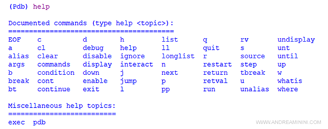 Per conoscere tutti i comandi di Python debugger basta digitare help sul prompt del dubugger.