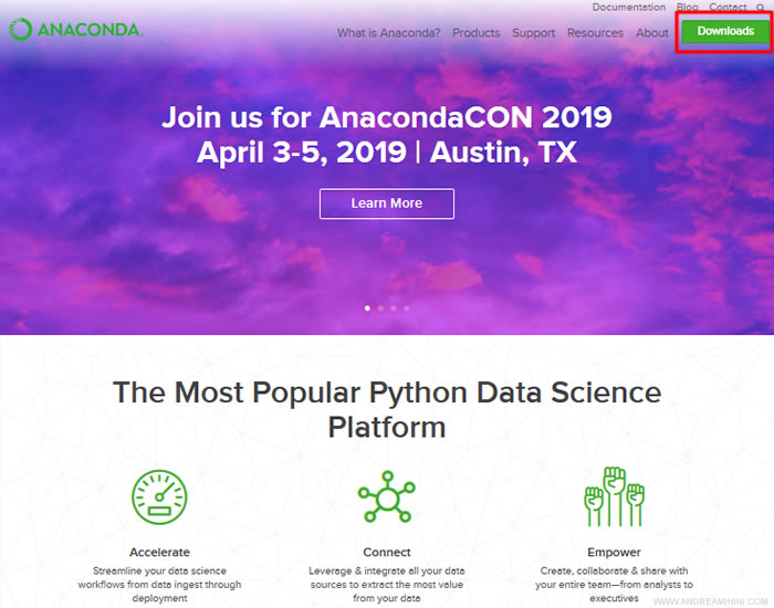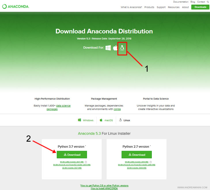 Per installare l'ambiente operativo di Anaconda e le librerie scientifiche di python su un PC con qualsiasi distribuzione Linux ( Ubuntu, Debian, Mint, ecc. ) entro sul sito ufficiale di Anaconda.