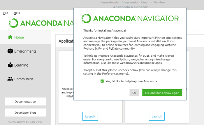Per avviare Anaconda apro di nuovo il terminale di Linux e digito