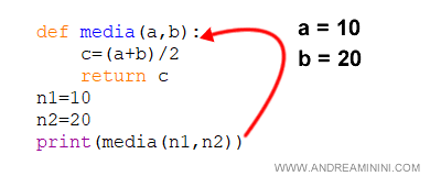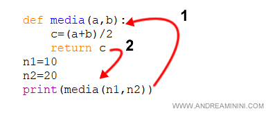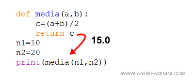 Poi richiama la funzione media(n1,n2) e stampa il risultato sullo schermo