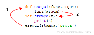 Nella quinta riga invoco la funzione esegui passandogli come primo argomento il nome della funzione 'stampa' e come secondo argomento la stringa 'prova'