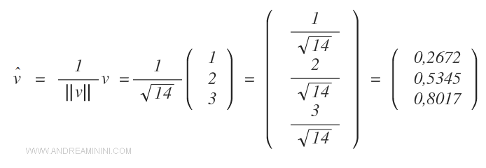 Ogni elemento del versore è ottenuto dividendo l'elemento del vettore v con la norma ||v|| del vettore stesso.