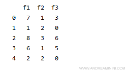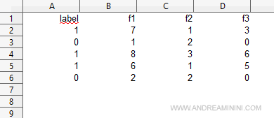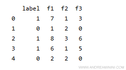 Ad esempio, creo un dataset banale con cinque esempi e tre attributi (f1,f2,f3).