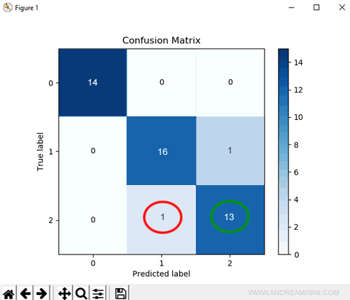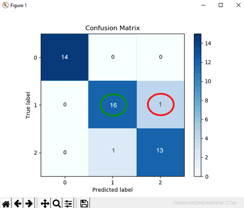 Nel dataset ci sono 17 risposte corrette (True label) che indicano la classe 1 ma il modello risponde correttamente solo 16 volte perché 1 volta prevede (sbagliando) la classe 2.