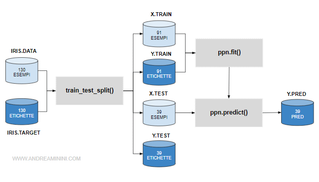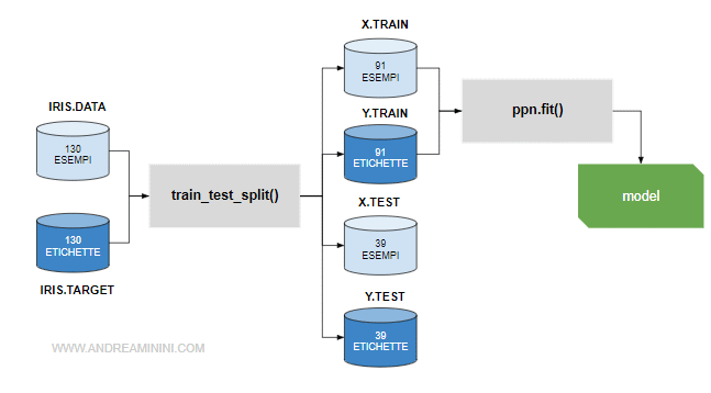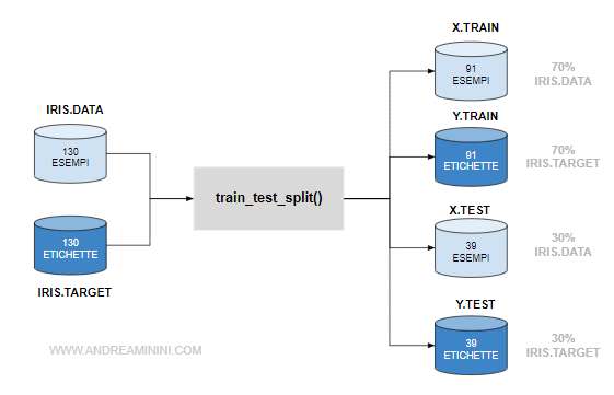 Nota. In pratica, la funzione ha diviso l'insieme degli esempi in due insiemi distinti, uno destinato all'addestramento (X.train) e l'altro destinato alla verifica finale (X.test). Poi, ha fatto lo stesso con l'insieme delle etichette (risultati).
