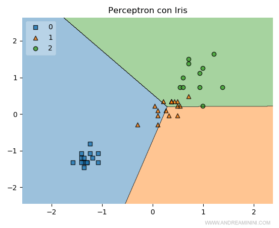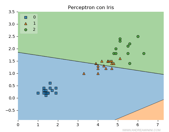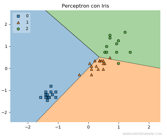 Nota. Il diagramma delle regioni mostra anche una limitazione evidente del Perceptron. L'algoritmo classifica i dati in modo lineare. E' uno dei limiti dell'algoritmo Perceptron perché è raro che i dati siano perfettamente separabili in classi in modo lineare. Pertanto, spesso l'algoritmo non converge a una soluzione. Per superare questo limite occorre cambiare algoritmo.