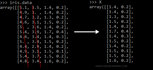 Per semplificità assegno gli esempi ( iris.data ) alla variabile X prendendo soltanto due misure, la colonna 2 e 3.