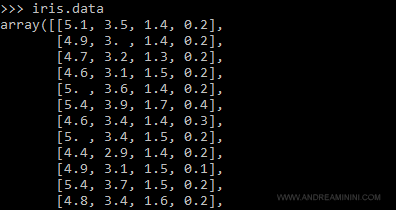 Poi, nella seconda riga, assegno alla variabile iris il dataset con il metodo load_iris().