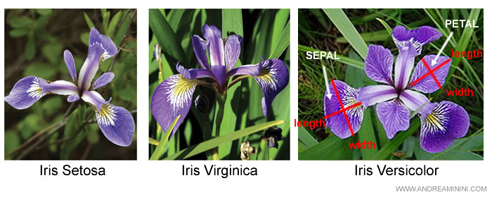 Ogni esempio misura quattro caratteristiche (lunghezza/larghezza petalo e sepalo) dei fiori Setosa, Virginica, Versicolor.