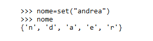 Nota. Quando si passa una stringa come parametro della parola chiave set tra parentesi tonde, il comando crea un insieme con i caratteri della stringa. L'insieme è composto dai caratteri senza ripetizioni. Ad esempio, la lettera "a" è presente due volte nel nome "Andrea" ma è un solo elemento dell'insieme.